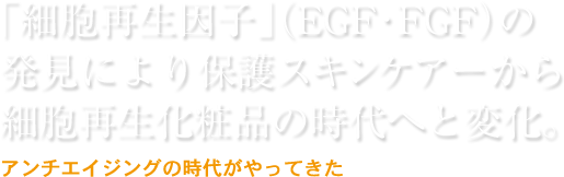 - 旧来型の化粧文化とは、いわゆるスキンケア化粧品文化だ。つまりビタミンやミネラルなどの皮膚栄養成分を補給することでスキンケアしようとしたり、植物由来成分を塗布することで皮膚に刺激を与えて活性をもたらそうとしたりする考え方をさしている。結論から言えば、いくら栄養や刺激を与えても、肌にコラーゲンやエラスチンが戻ってくることはなかった。EGF(上皮細胞再生因子)という革新的な成分が登場して、ようやくそれが可能となった。EGFが化粧品業界に大きな革命をもたらしたといってもいい。